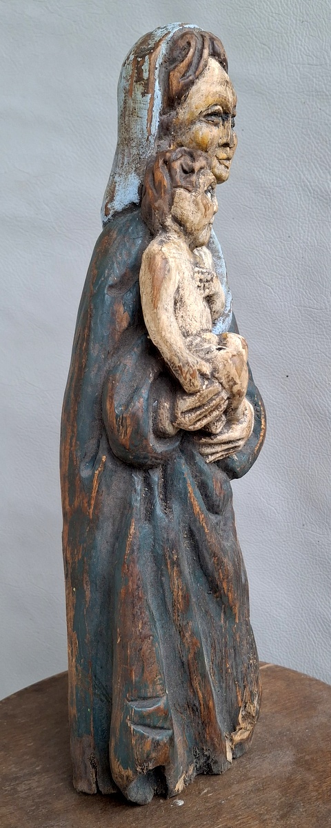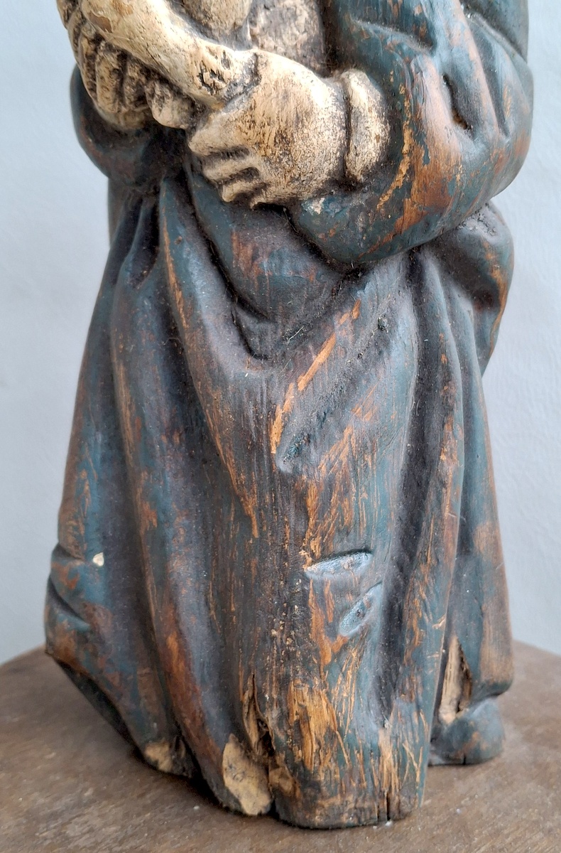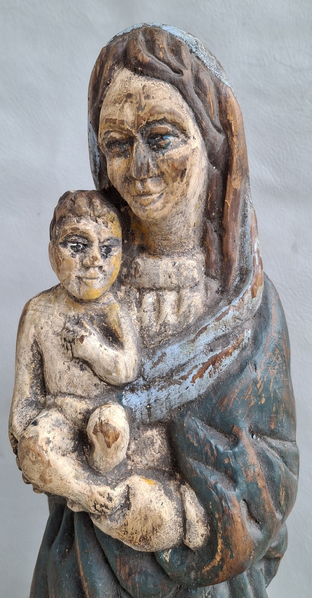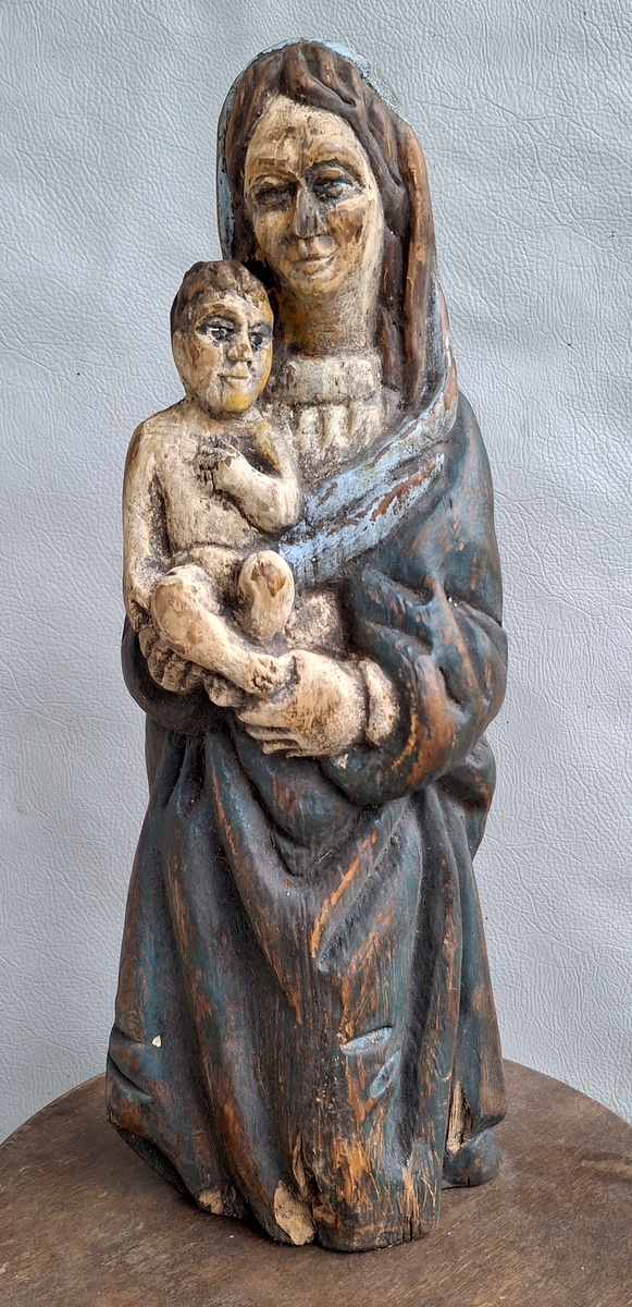 Liutuviška Žemaitiška medinė labai sena skulptūra Marija su Kūdykiu.