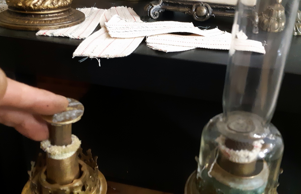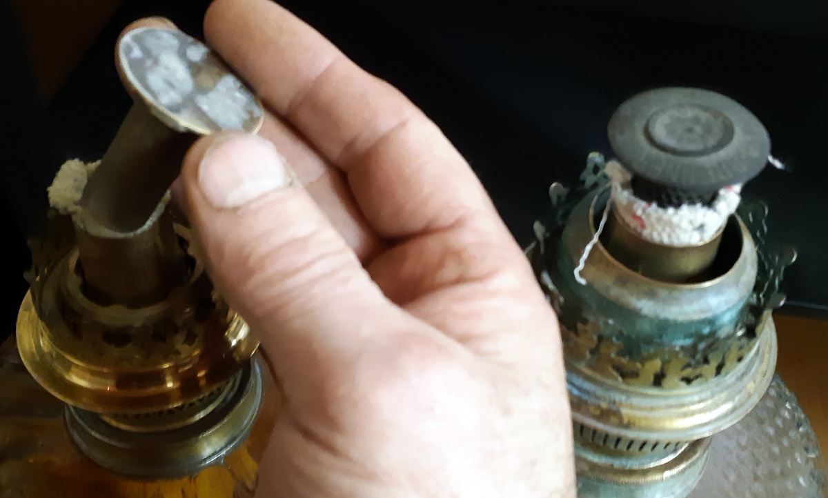 Cтарые богатые керосиновые лампы. С новыми фитилями и рабочие с полной комплектацией, -то есть, все механизмы крутящие фитили рабочие, а некоторые механизмы с фетелями имеют и дополнительные так называемые шапки, для того чтобы когда зажигается фитиль, пламя горела кругом, а не прямым огнем. (есть 1 фото как пример).