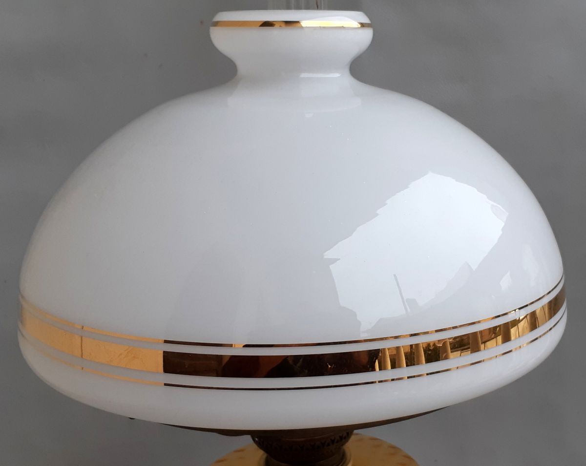 TAIP PAT kas ieško savo lempai TIK GAUGBTO, galima atskirai nusipirkti tik jį (foto yra). Gaubto IŠMATAVIMAI: išorinis dugno skersmuo (montavimo anga ant lankelio)- 23,3 cm, pilnas skersmuo- 27 cm, aukštis-19 cm. , KAINA – 45-55€. (Gal būt galime gauti ir kitokių išmatavimų žibal. lempų GAUBTŲ – rašykite, klauskite).