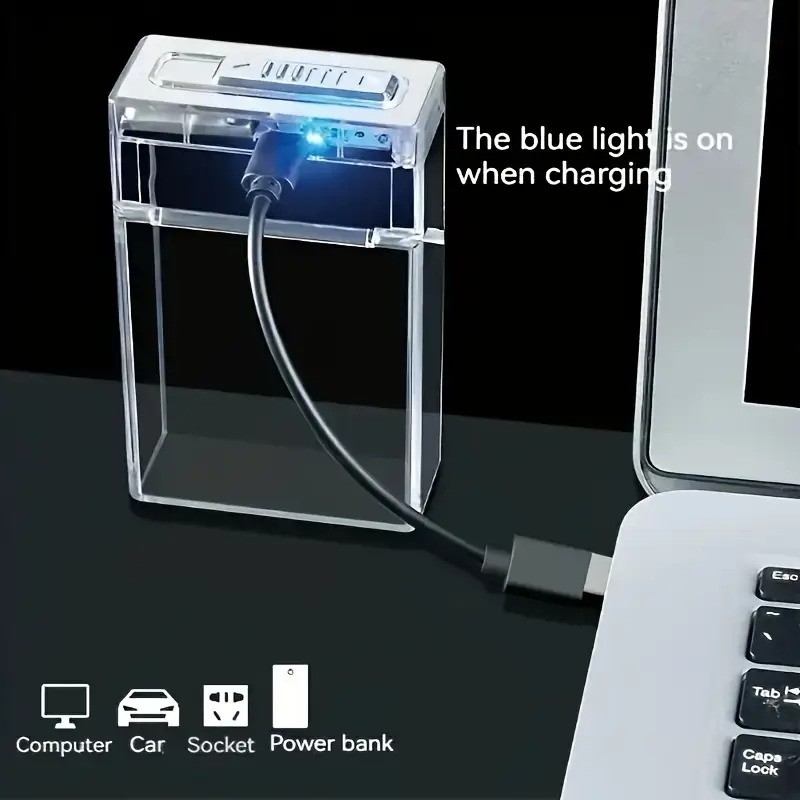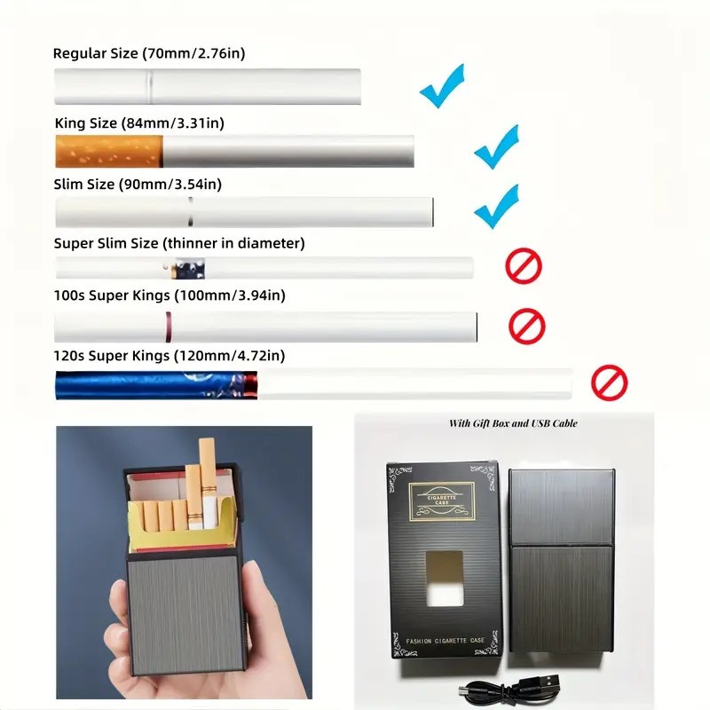 1) Visiškai juodas įkraunamas žiebtuvėlis su integruota cigarečių dėže, atsparus vėjui, talpina 20 cigarečių, atsparus slėgiui, drėgmei, atverčiamas žiebtuvėlio dėklas, stilingas verslo ir kasdieniam naudojimui. Taip pat įkraunamo žiebtuvėlio pakrovimo laidas.